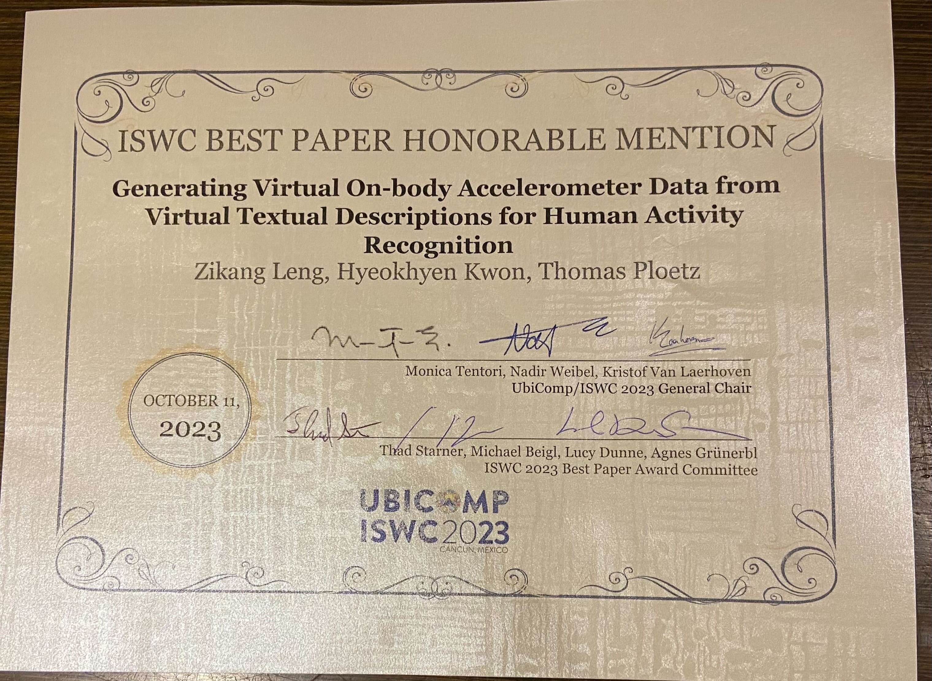 Nice surprise at this year’s Ubicomp/ISWC conference: Zikang, Hyeok, and Thomas received a best paper honorable mention award for their paper “Generating Virtual On-body Accelerometer Data from Virtual Textual Descriptions for Human Activity Recognition”